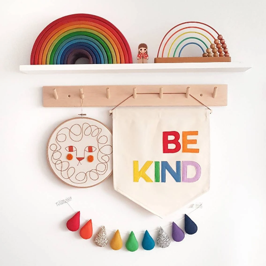 Be Kind wall hanging in a choice of Rainbow Bright, Candy Pop or Simple Black colourways.