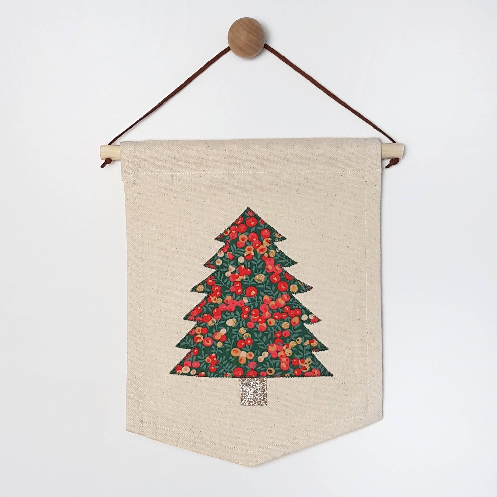 Liberty print fabric stitched onto organic cotton with a hardwood dowel and vegan leather strap for hanging.