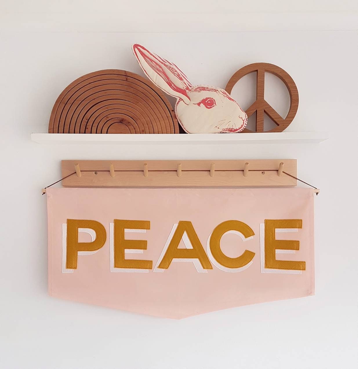 Multi colour felt stitched onto organic cotton with a hardwood dowel and vegan leather strap for hanging.