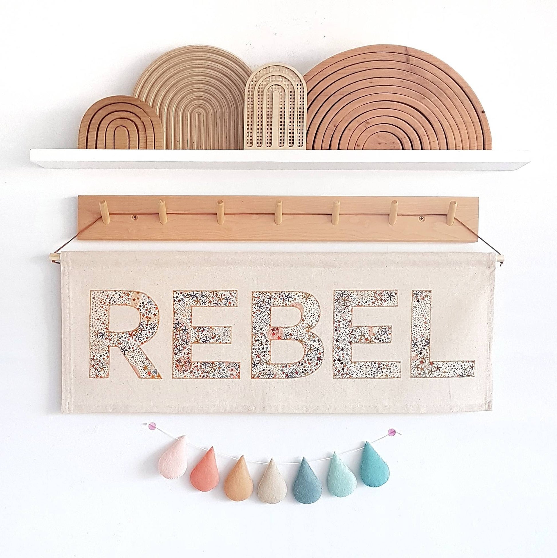 Printed cotton Liberty fabric stitched onto organic cotton with a hardwood dowel and vegan leather strap for hanging.