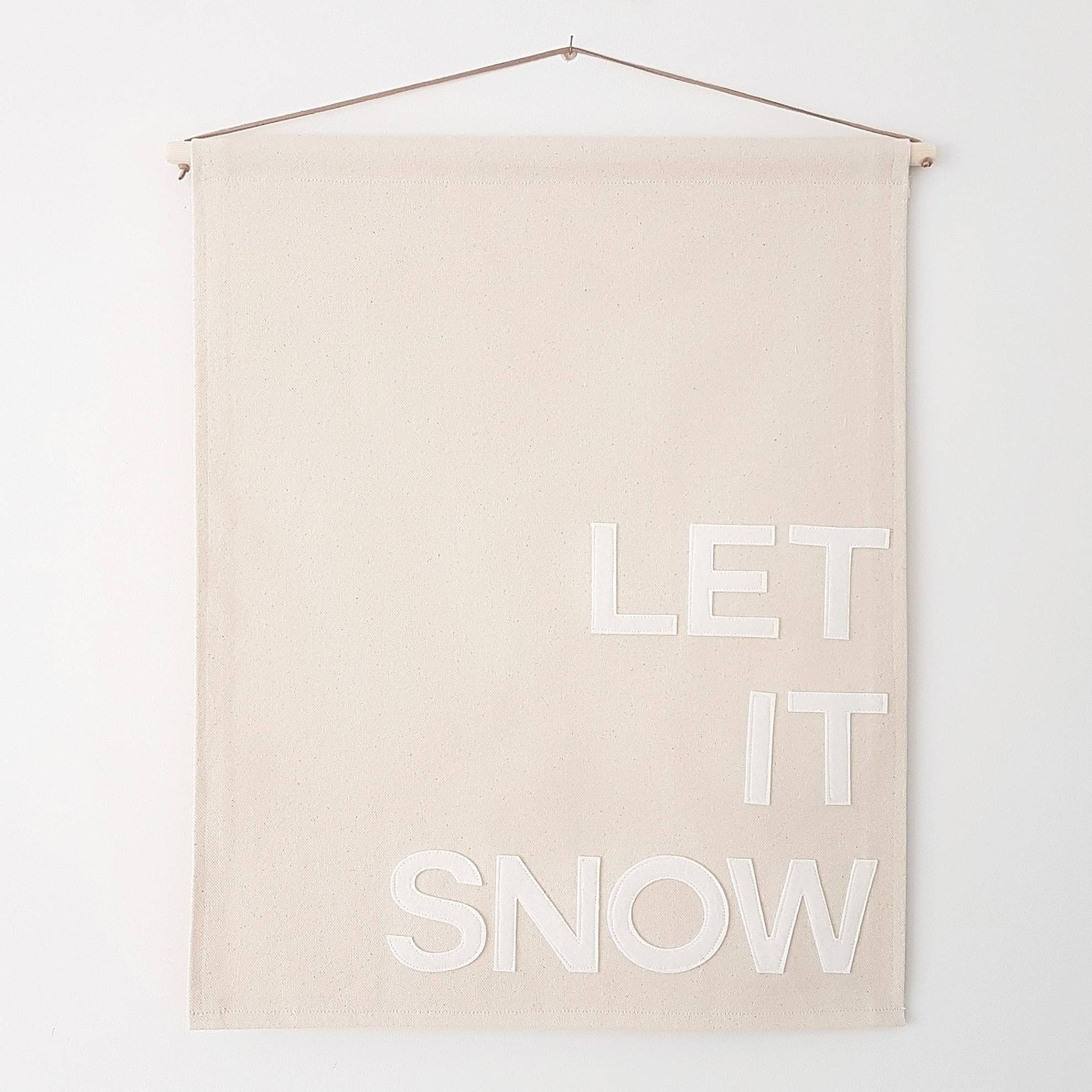 Choose between white wool blend felt or silver or gold glitter felt, stitched onto organic cotton with a hardwood dowel and vegan leather strap for hanging.