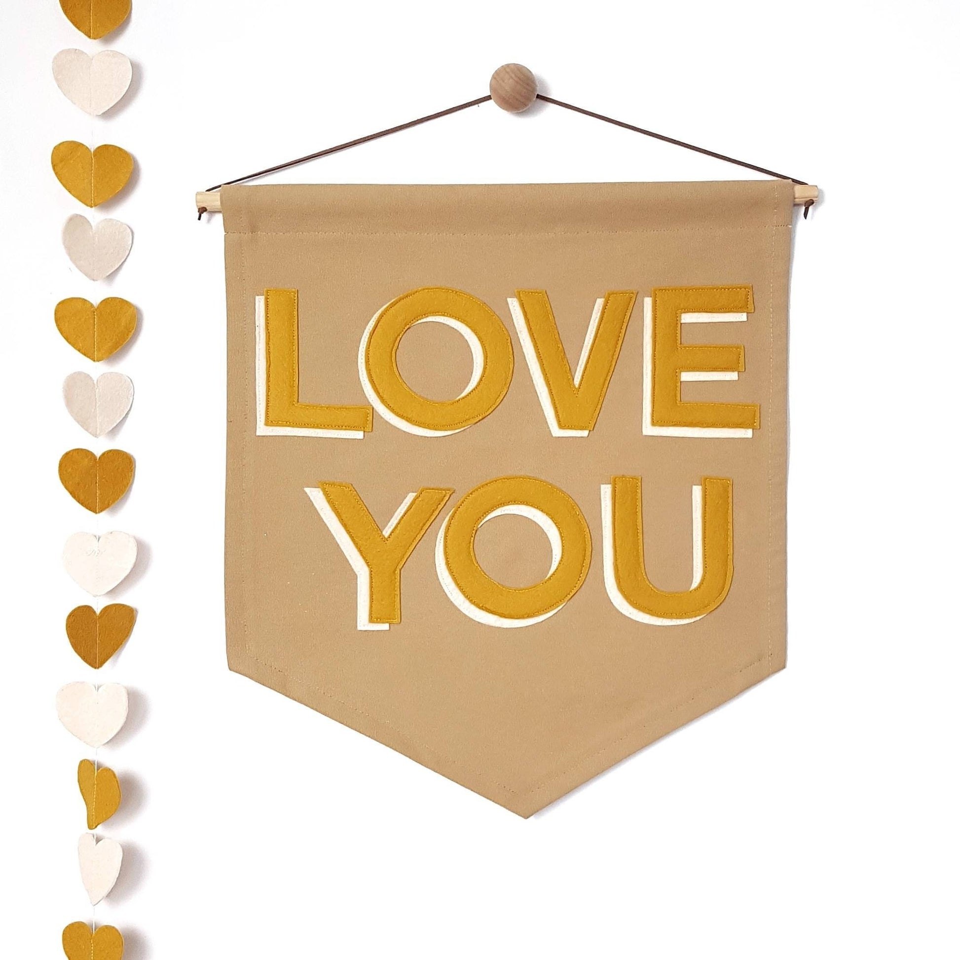 Love You, custom colour banner/wall hanging with matching heart garland.