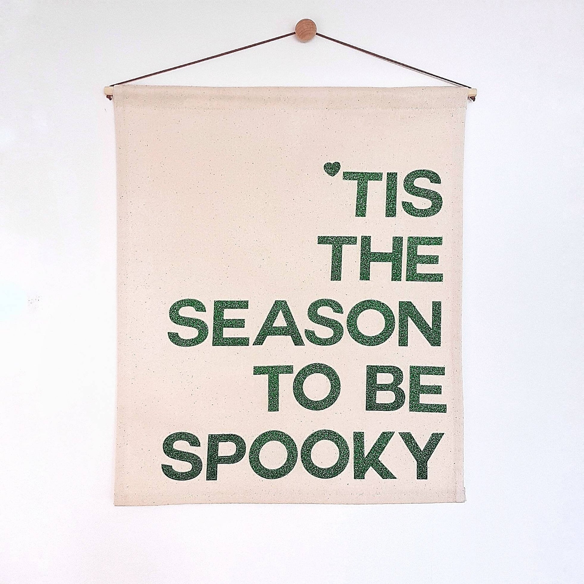 Green glitter felt stitched onto organic cotton with a hardwood dowel and vegan leather strap for hanging.